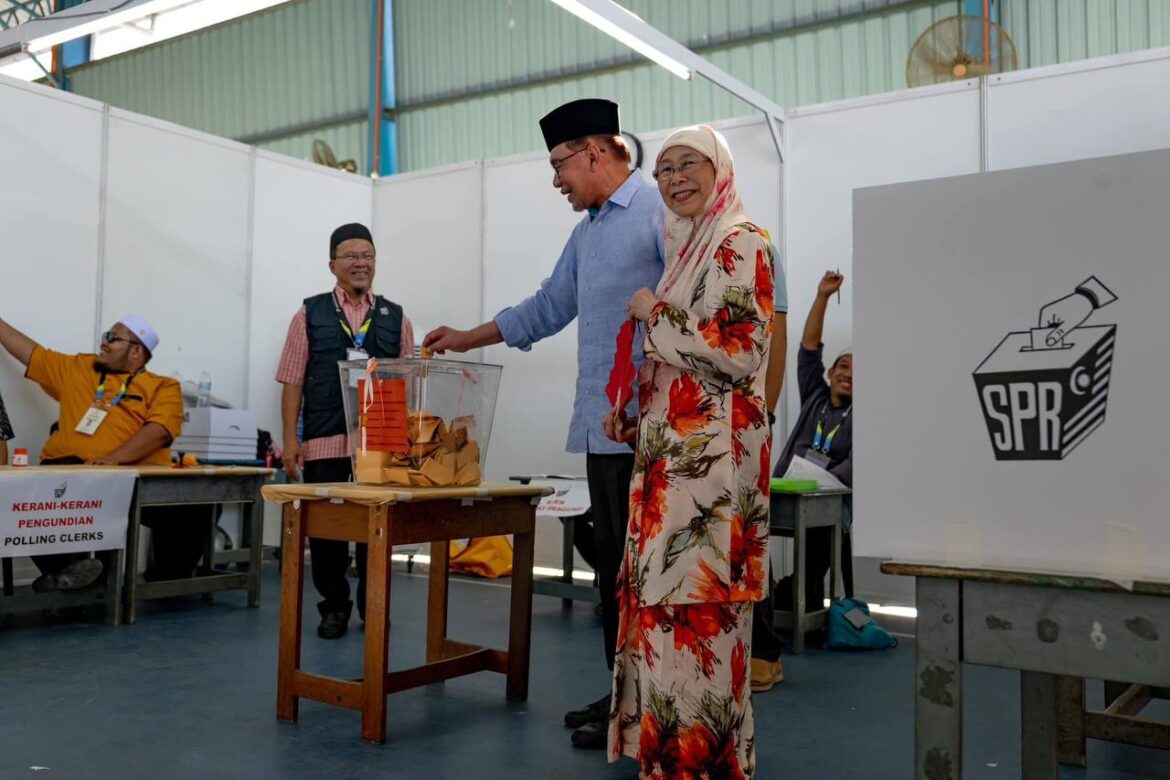 Perdana Menteri tiba kira-kira jam 9.32 pagi ditemani isterinya, Datin Seri Dr Wan Azizah Ismail sebelum memeriksa saluran pengundiannya di pondok Suruhanjaya Pilihan Raya (SPR).
