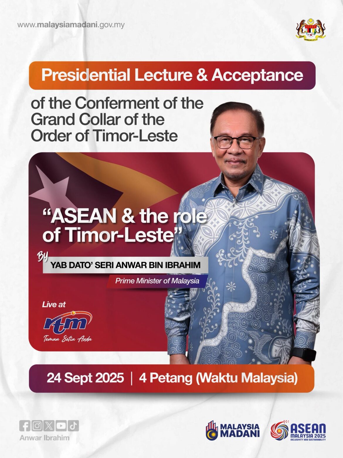 DILI:Perdana Menteri, Datuk Seri Anwar Ibrahim, akan menyampaikan ucaptama dalam siri Presidential Lecture di Istana Presiden sempena lawatan rasmi beliau ke Timor-Leste, hari ini.