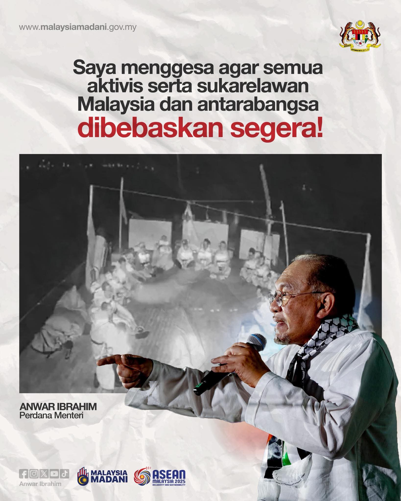 Malaysia turut menuntut agar semua aktivis, petugas kemanusiaan dan kru kapal dibebaskan segera serta penghantaran bantuan kemanusiaan ke Gaza dibenarkan tanpa sebarang halangan.