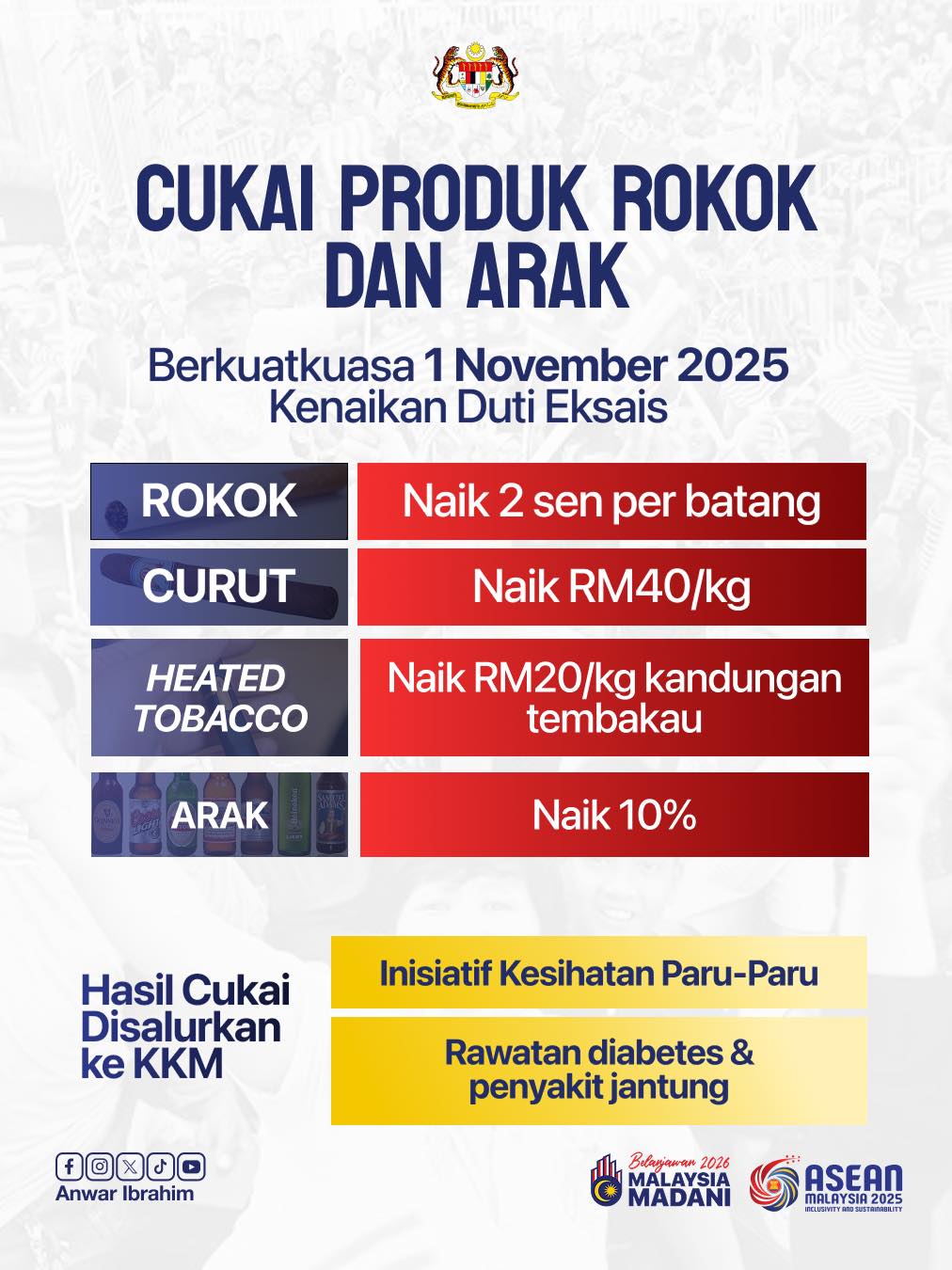 KUALA LUMPUR – Kerajaan mengumumkan kenaikan kadar duti eksais ke atas produk rokok dan minuman keras berkuat kuasa mulai 1 November 2025, sebagai langkah mengurangkan kadar perokok serta menggalakkan gaya hidup sihat dalam kalangan rakyat.