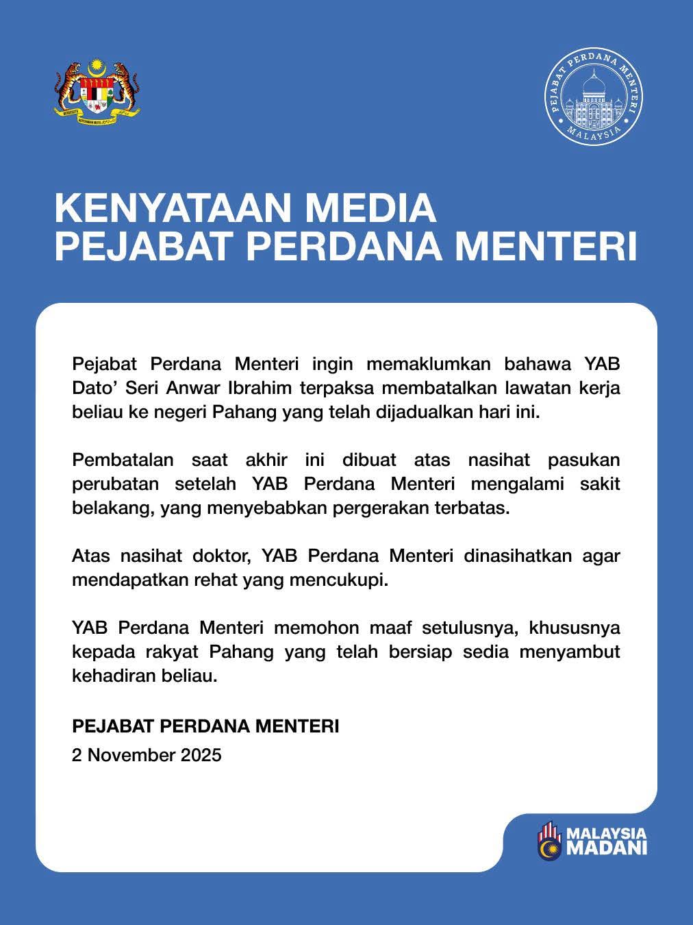 KUALA LUMPUR: Perdana Menteri Datuk Seri Anwar Ibrahim terpaksa membatalkan lawatan kerja ke Pahang yang dijadualkan berlangsung hari ini selepas mengalami masalah kesihatan.